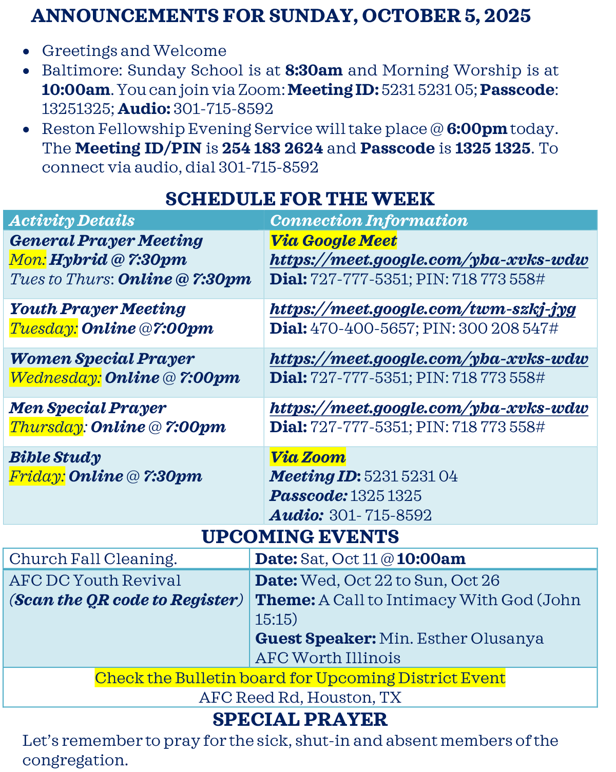 Sunday evenings service starts at 6pm. join Reston Fellowship Service via Zoom. The Meeting Passcode: 13251325, Meeting ID: 254 183 2624.